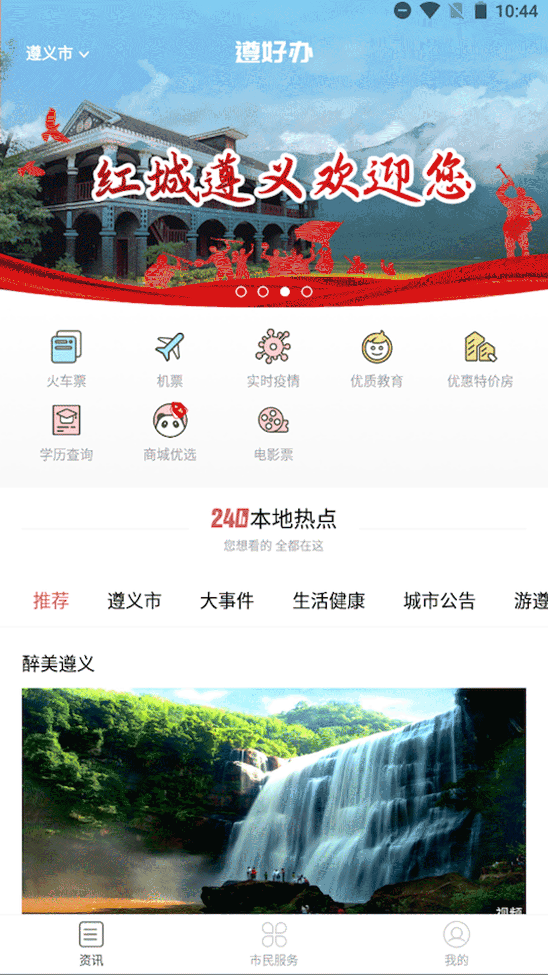 2.红色城市欢迎你,火车票、机票、实时疫情查看各种优质的教育服务,学历查询,本地精选商城。