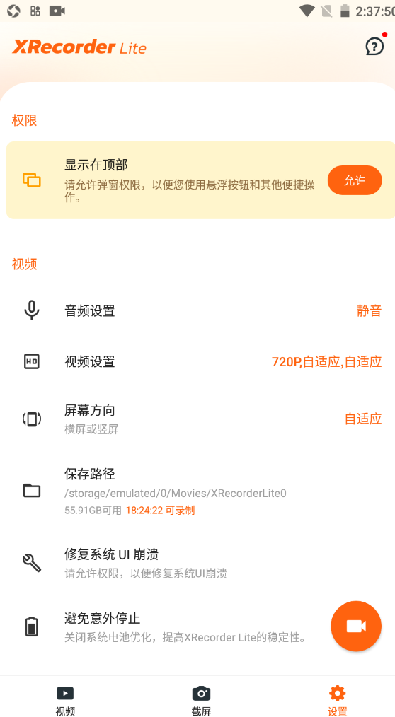2.XRecorder Lite帮助你快速的录屏,满足你的所有录屏要求,一站式悬浮窗录屏设置更加方便。