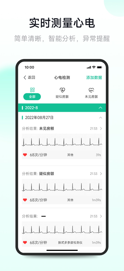 2、随时随地了解心脏状况:只需一款app,即可随时随地进行心电监测,让您随时掌握心脏状况,免除后顾之忧;