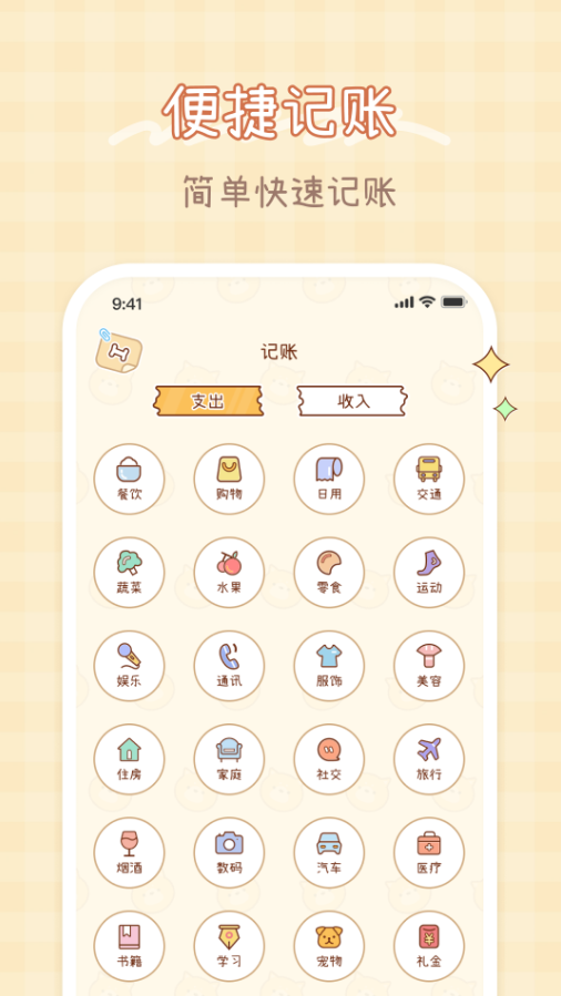1、开启小芳记账app,点击主界面的记账功能键,选择相应的收支类型,如餐饮、购物等,再输入金额即可完成一笔记账。