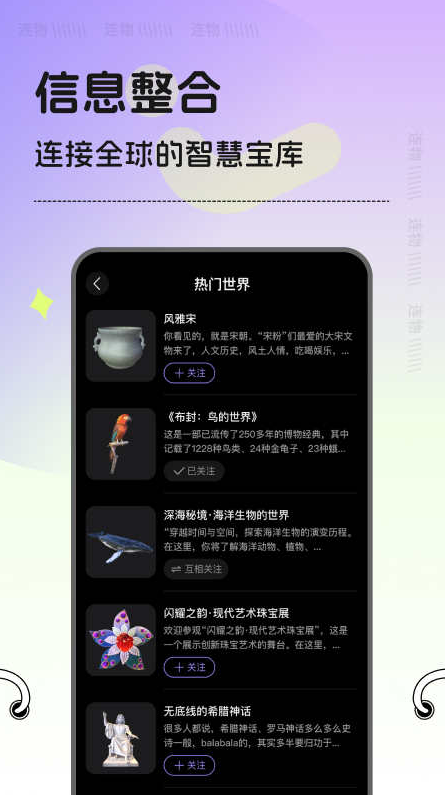 1、丰富的艺术形式:无论你对哪种艺术形式感兴趣,连物次元都能满足你。这里有优雅的古典乐,奇妙的现代艺术,还有散发着历史沧桑感的艺术珍品等等,让你在艺术的海洋中畅游。