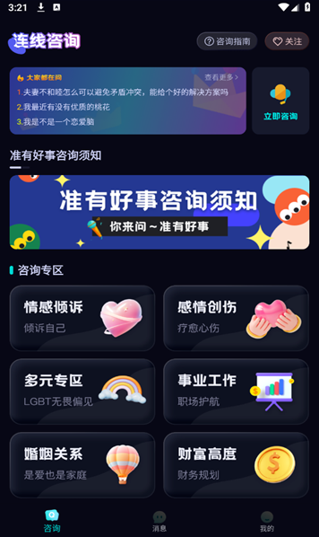 2、根据您的个人喜好,选择文字、语音或视频的咨询方式,预约咨询时间,然后在约定的时间内开始您的咨询之旅。无论何时遇到困扰或疑问,准有好事都是您可以随时求助的朋友。