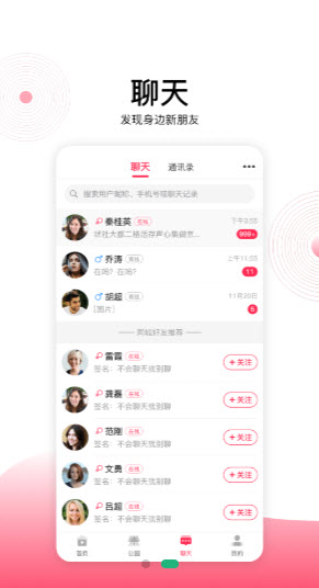 1、在线聊天,认识新友,通过匹配,畅聊人生或兴趣喜好。