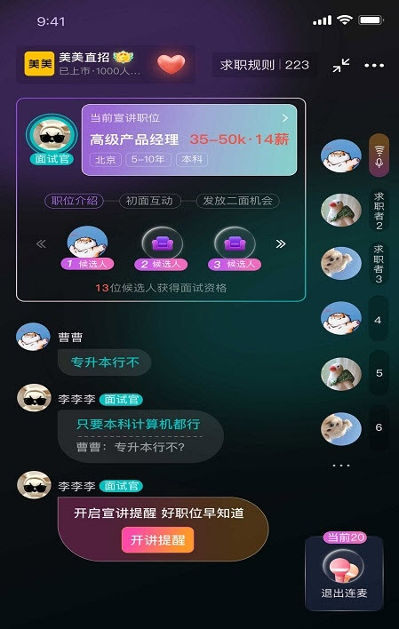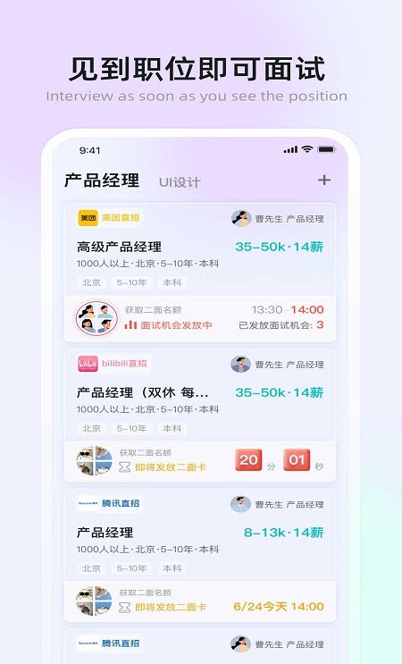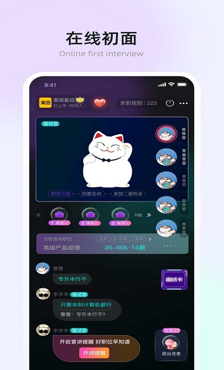 1、独有在线面试功能,让您不出门就可以完成面试。