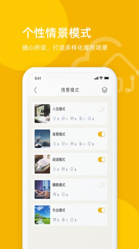 2、个性化的情景模式:借助AI技术,软件的情景模式可以依据客户个人需求进行设置,无论是温度、灯光还是音乐,只需动动手指,即可为客户打造独唱心动的房间环境。