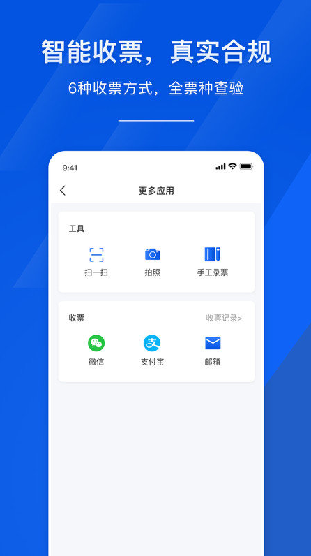 3、智能收据方式:解决传统企业收票难题,app内设有智能收票功能,可以方便地搜索、扫描和录入收票信息,极大的提升了收票效率和准确性。