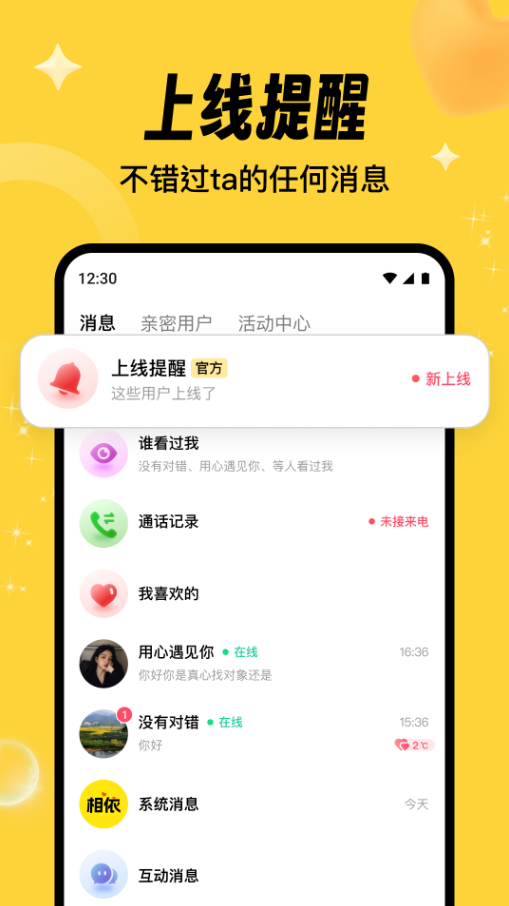 1、实名认证:软件的立足点在于信息的真实性,这就使相依交友app区别于其他交友应用,坚决反对虚假和欺骗性的信息,推行严格的实名认证。