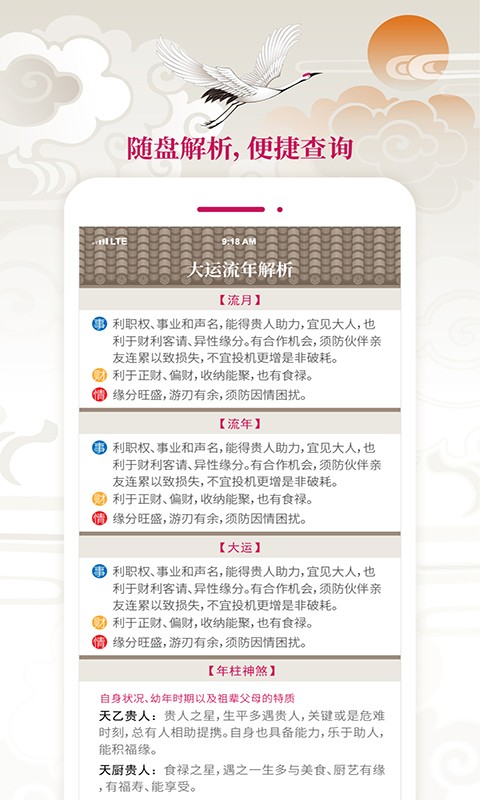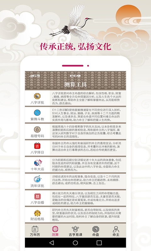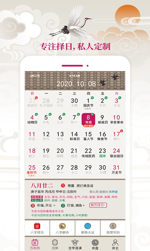 它提供了个人运势择吉黄历、专业测算工具、日历、黄历、流日、紫微斗数、