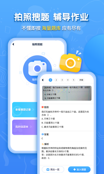 1、提供了配套拍照搜题功能,遇到问题时可以直接拍照上传题目,让系统识别并给出解答。