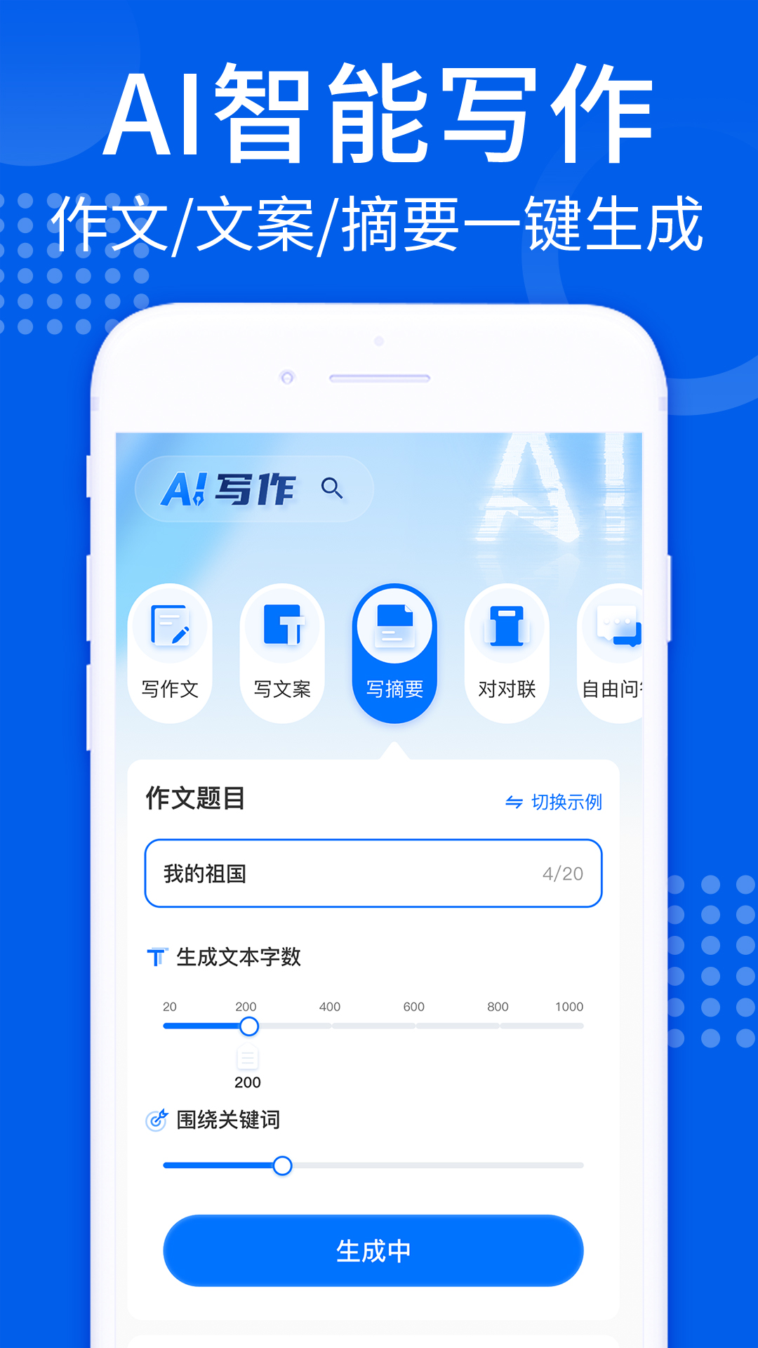 3.所有的文案摘要一键自动生成,智能对联功能,提供超多的功能,自定义设置,拯救写作困难的你。