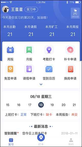 它提供了一站式服务,包括本月出勤、周报、月报、补卡申请、