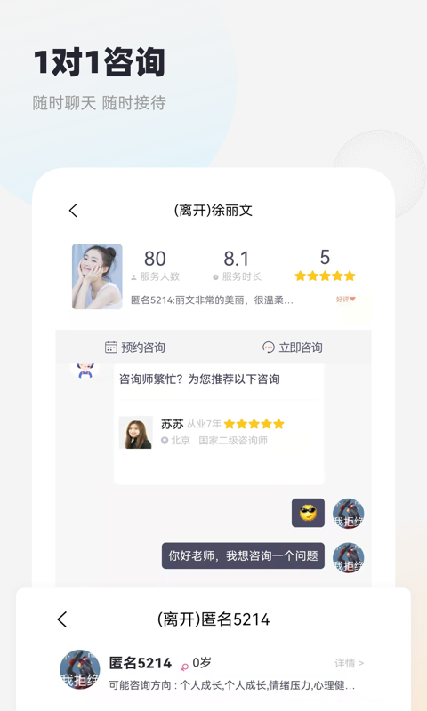 1、立即咨询,用户可以随时随地进行在线咨询,专业心理咨询师提供即时帮助和建议。