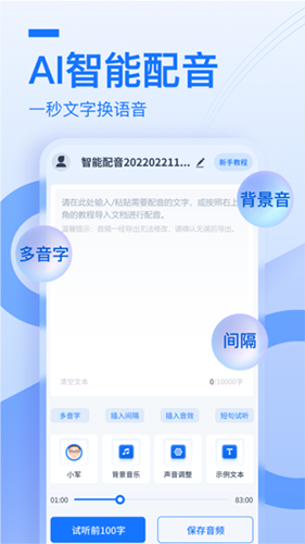 3、智能配音功能,根据输入文本内容和录制的声音进行智能匹配,使得配音更加自然流畅。