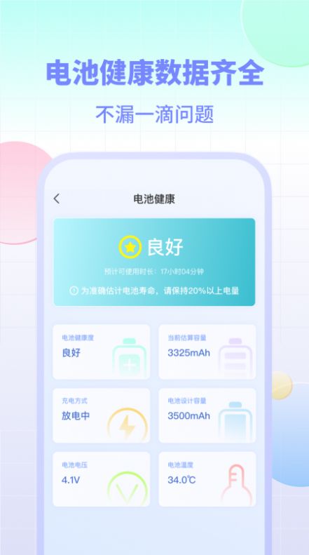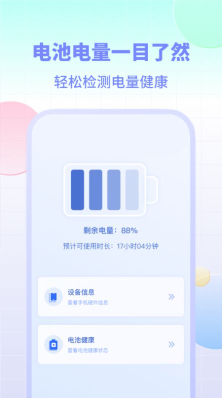 电池小组件app是一款好用的手机电池软件,这款软件拥有非常实用的手机电池功能,能够在线为你的电池进行检测服务,同时还能够在线优化你的手机运行,缓解你的手机后台压力,为你节约耗电,提升续航时间,同时软件还能够对你的电池状态进行检测。