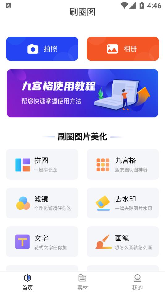 刷圈图app是一款拍照修图p图功能的手机软件,软件内还有素材供用户参考,寻找拍照的灵感。拼图,去水印,九宫格,贴纸等等功能都俱全,一款很受年轻人喜欢的软件。