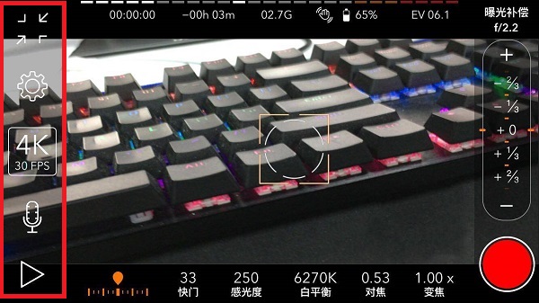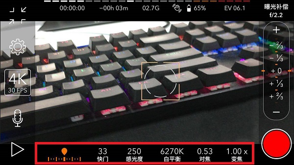 4、在下面一栏中,可以更改快门、感光、白平衡、对焦、变焦等参数。