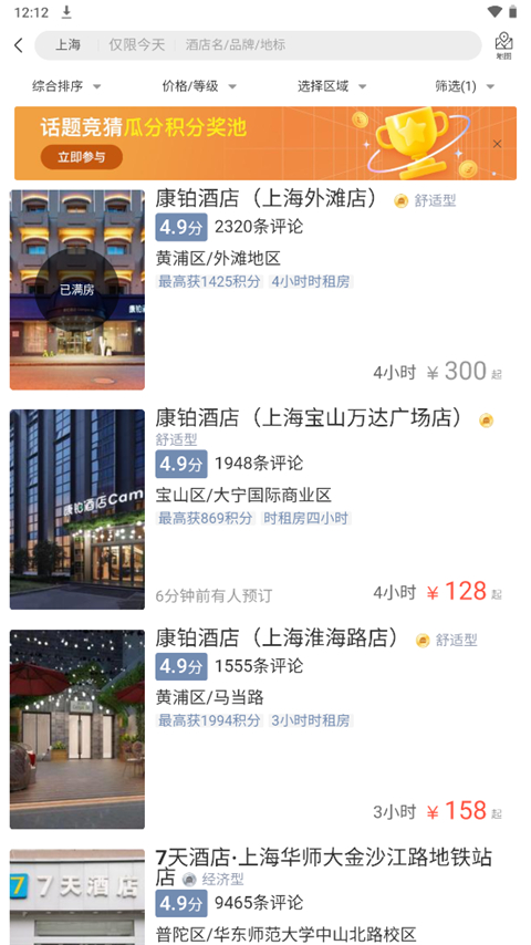 4、它会就会为用户提供拥有所有有钟点房的酒店,选择自己想要的酒店,点击进入;