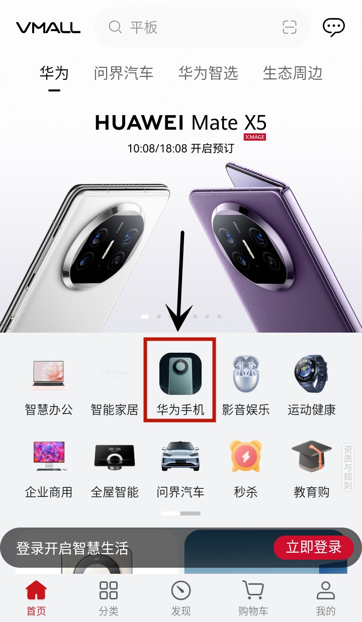 1、在本站下载安装华为商城手机客户端,打开软件,在主页点击“华为手机”。