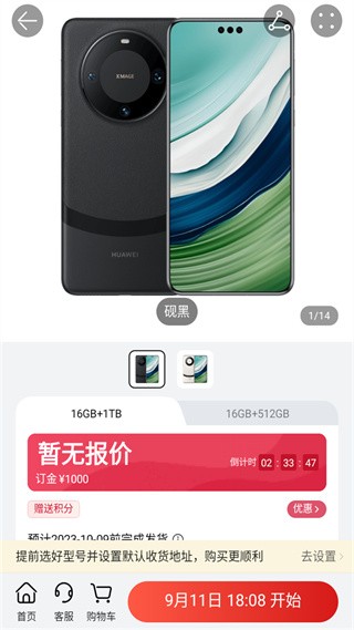 2、点击进入想要抢购的华为Mate60系列手机型号购买页面。