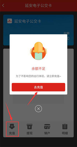 1、当我们打开电子公交卡二维码时,如果余额不足会收到提示消息,然后点击提示下方的【去充值】按钮,或者左下角的【充值】入口均可。