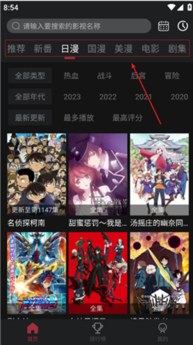 1、软件包含很多种类的视频,有智能推荐、新番、日漫、国漫、美漫、电影、剧集等。选择对应的分类之后还可以选择类型和年代等,快速查找想看的视频。