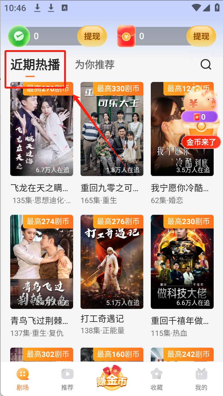 1、点击“近期热播”查看热门短剧列表。