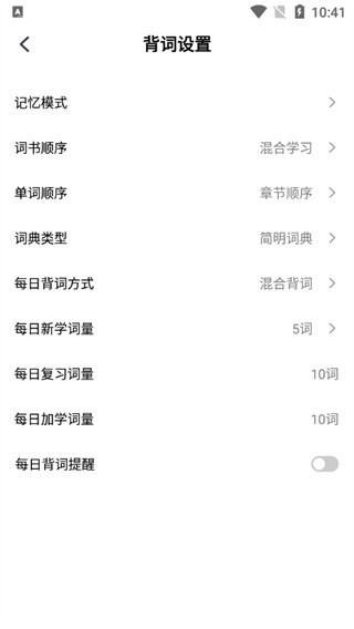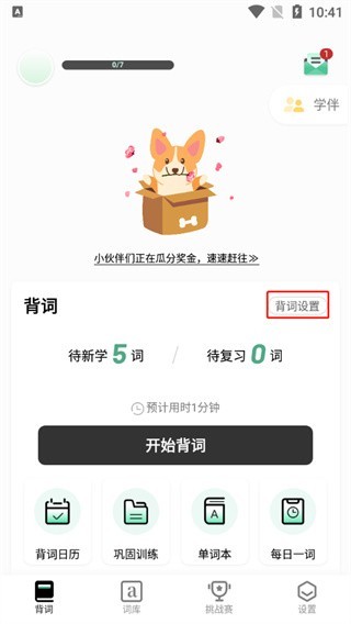 3、点击设置,在这里可以调整背词设置;