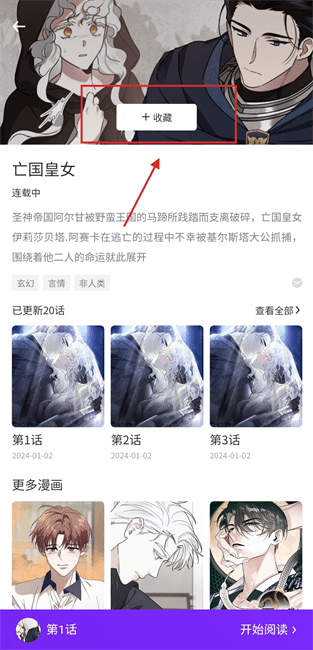 4.可通过分类或是搜索的方式来找到感兴趣的作品,并点击进入,可以看到作品主页上方有个“+收藏”,点击即可加入书架