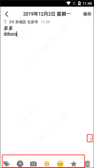 2、在下方,依顺序分别是标签设置、时间添加、图片添加、天气选择、心情选择、收藏设置、删除等功能,并右下方表示是数字;