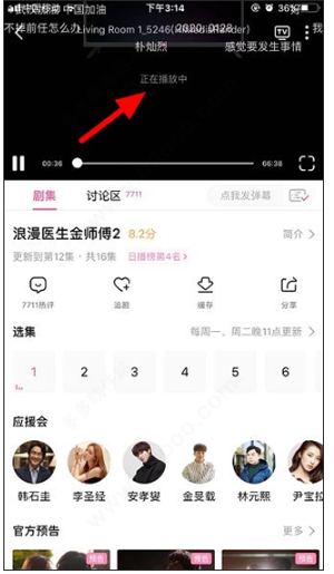5、提示“正在播放中”,就说明韩小圈中的视频内容就已经成功投屏到电视上了,投屏时还可以在手机上看弹幕。