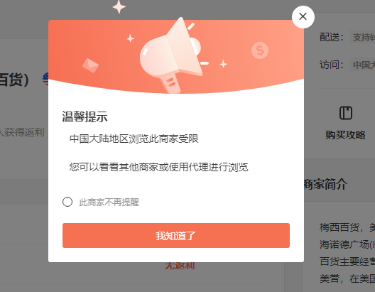 “中国大陆地区浏览此商家受限”