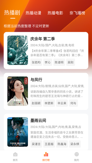 4、进入到“排行榜”界面中,可以查看到当下最热门、播放量最高的剧集、动漫、电影等,轻松发现更多优质影视资源。