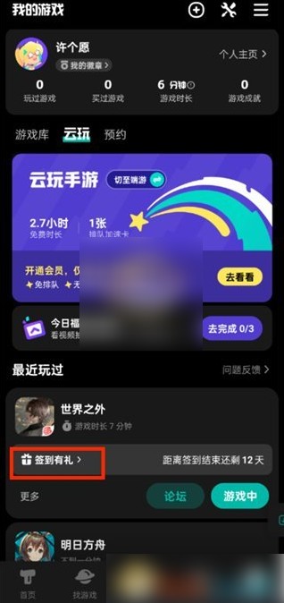 3、接着来到云玩的页面中后我们可以看到有一个【签到】的按钮;