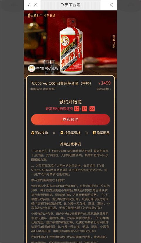 3、小米有品茅台抢购时间是工作日(周一到周五,遇到大促另行规则)20:00-20:30点,提前预约成功后和有抢购资格,才能在开卖时候抢。如遇大促期间以实际抢购时间为准;