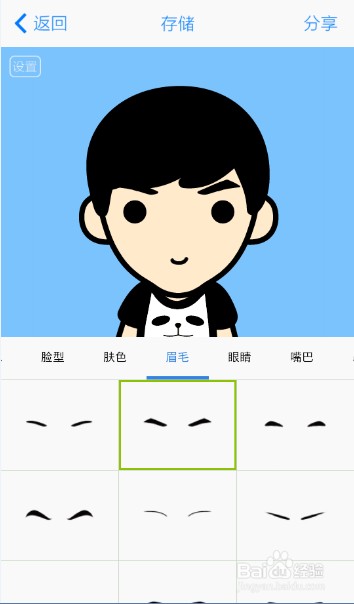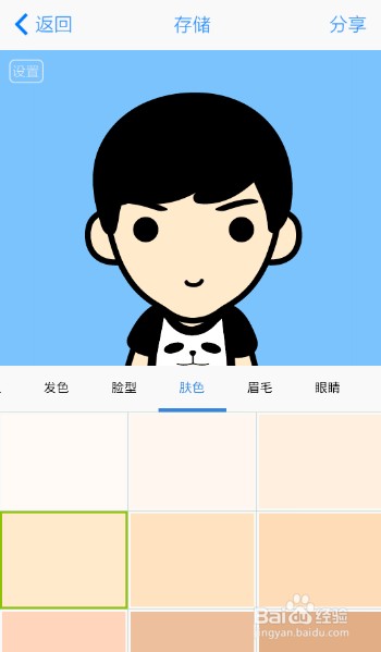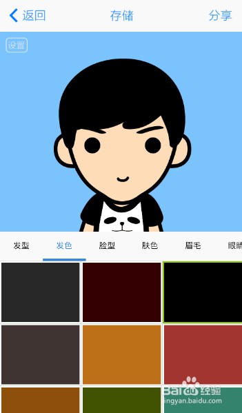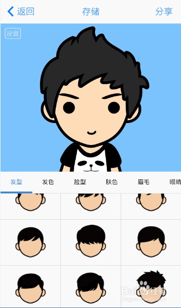 2、接下就是你设置你喜欢的萌图样子,通过左右滑动页面可切换类别,比如发型、发色、脸型、肤色、眉毛这些基本的制作动漫头像所需要的素材。