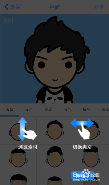 --用脸萌打造个性化头像方法很简单。用户首先选择所制作头像的性别,通过左右滑动页面可切换类别,比如发型、发色、脸型、肤色、眉毛这些基本的制作动漫头像所需要的素材。