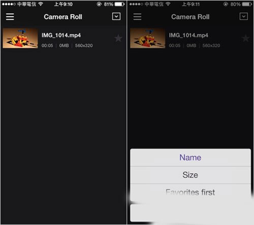 KMPlayer 外观设计其实很精美,操作上也很简单,可直接预览目前手机里的影片,或是播放音乐。利用主画面上方的筛选功能,可依照影片名称、大小或我的最爱进行排序。