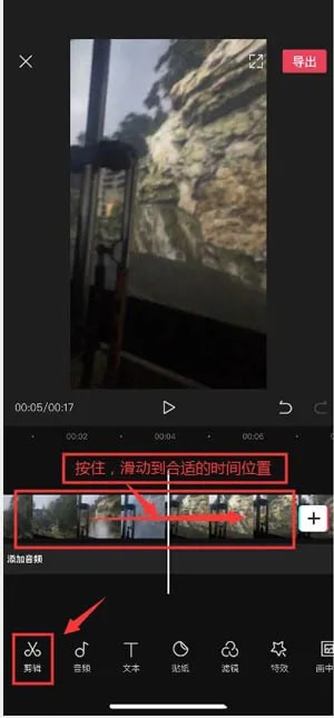 3.之后,我们可以下方的视频略缩图中,左右滑动调整视频帧,然后为当前选中的帧添加特效、音频等等;