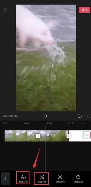 9.添加字幕:在视频对话时,在说话时,为视频添加字幕可以让用户更加知道我们的视频内容,我们选择新建文本或者识别字幕,添加视频字幕;