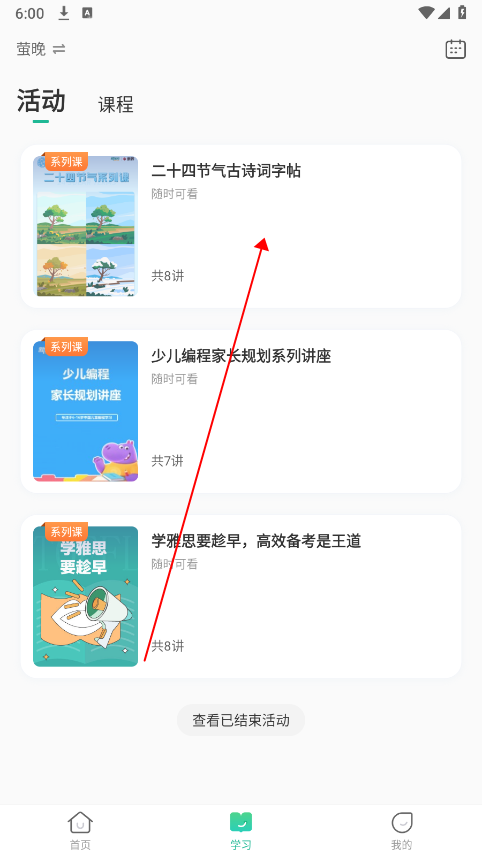 1、进入软件,点击下方学习选项,选择报名完成的课程