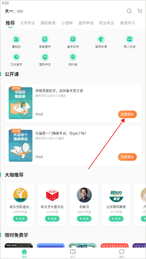 1、进入新东方app最新版本首页,点击需要报名的课程