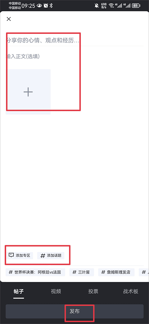 2、进入后输入你要发布的内容并点击发布即可,点击添加专区或话题可以让帖子发布在喜欢的专区下
