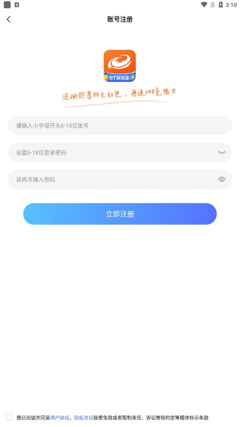 3、输入账号和密码点击立即注册。