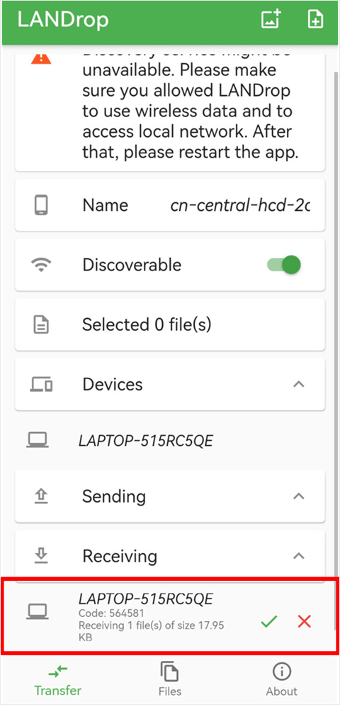 手机端Landrop应用会在【Receiving】(接收)栏显示一个来自电脑的握手标志。