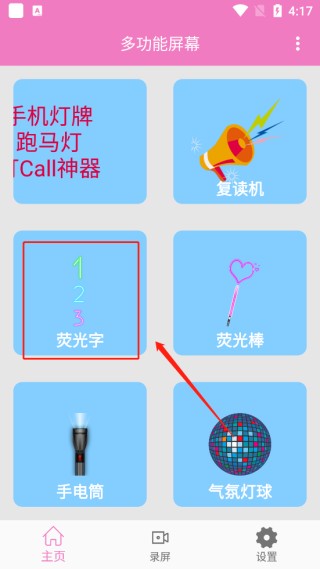 2.选择荧光字功能:在首页中,找到并点击“荧光字”这个板块,准备开始创作荧光字。