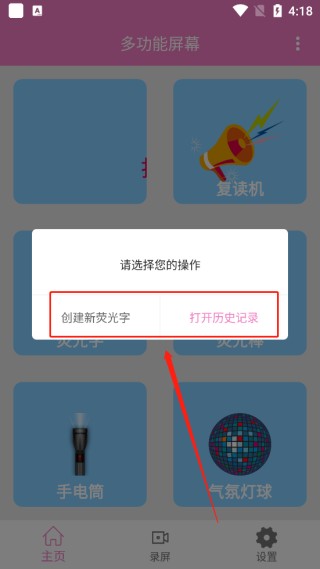 3.新建或继续编辑:如果你之前已经创建过荧光字并想继续编辑,就点击“打开历史记录”选择之前的作品。如果你是第一次使用,或者想创建一个新的荧光字,就点击“创建新荧光字”。