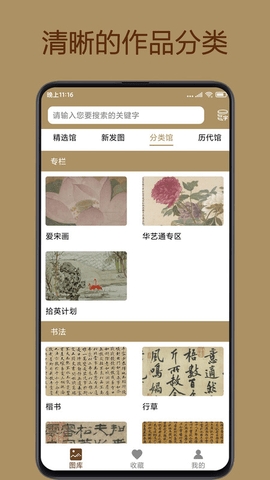 5、提供分类馆,按照专栏、书法等分类方式为你展示了各种艺术作品;
