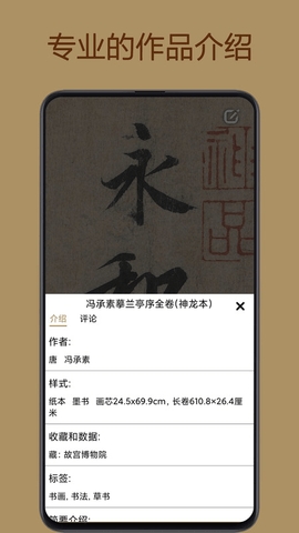 1、这是一个高清文物字画图片欣赏软件,这里有非常强大的作品库,收藏了相当大的字画,书画艺术品,而且可以高清放大观看和欣赏文物
