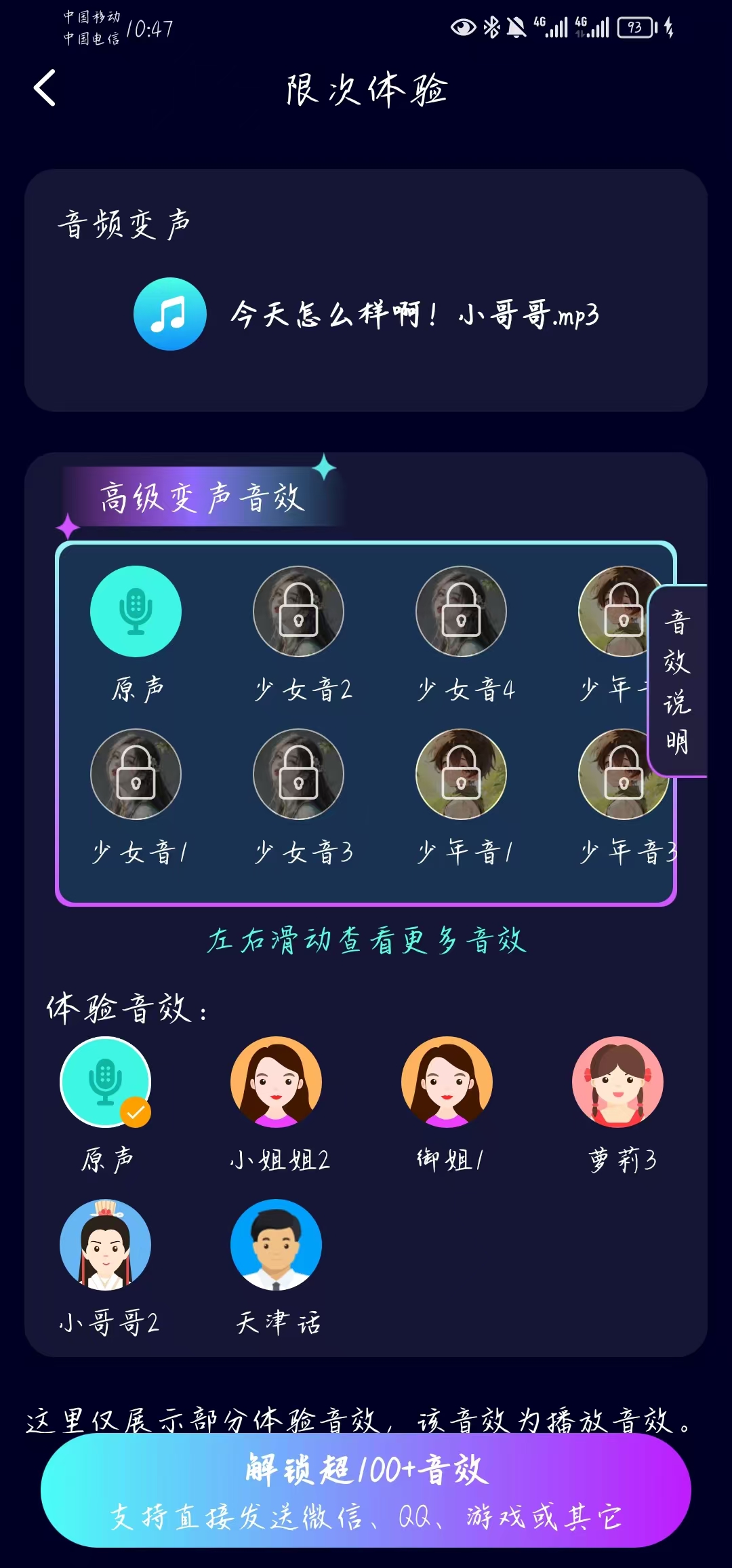 进入音频变声页面,可以选择一段音频,可以是一首歌曲也可以是一段语音,同样试听各种音效,直到得到想要的效果即可保存并分享。