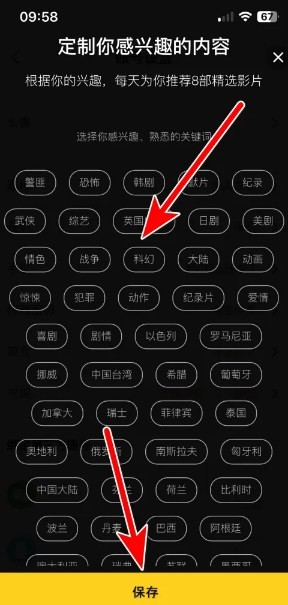选择完目标兴趣内容后,点击页面上的【保存】按钮。APP会根据用户的兴趣设置,调整推荐内容,使用户在浏览和搜索时能够看到更符合自己喜好的影视信息。